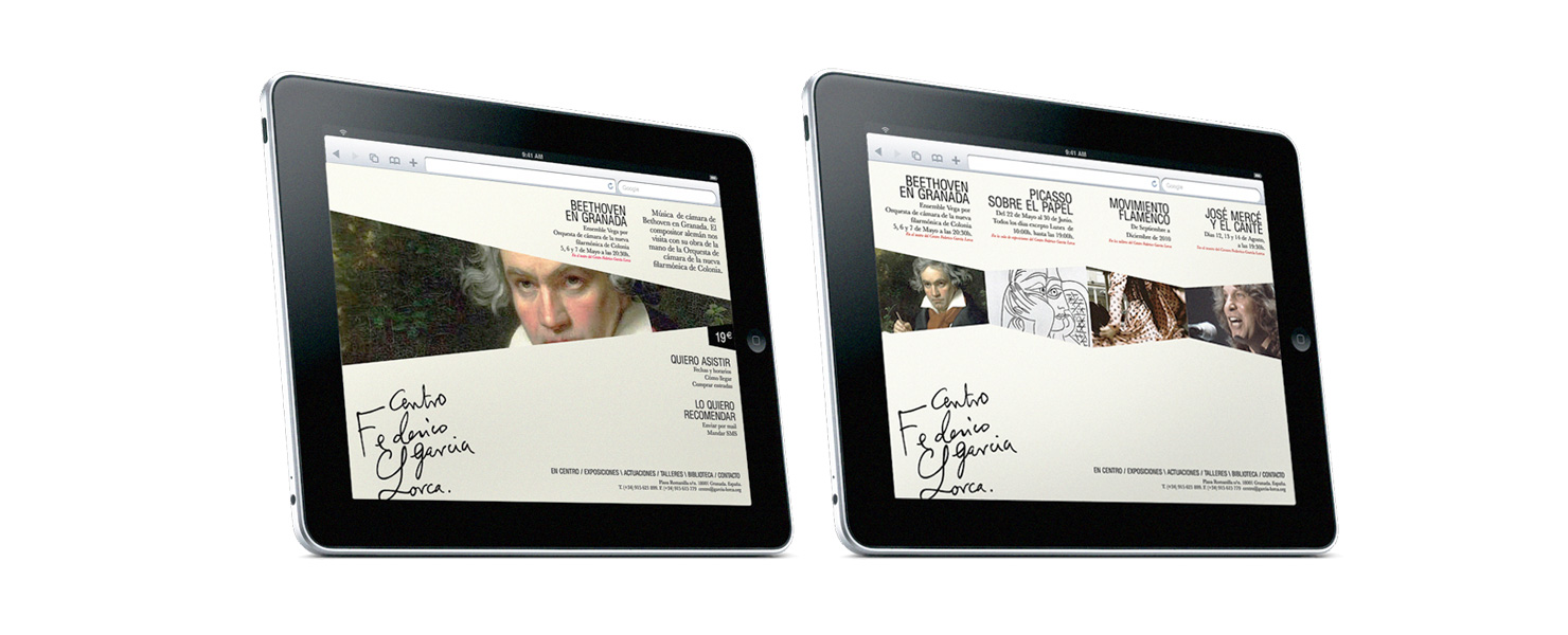 Para crear el logomarca partimos de la propia letra del poeta. Tras estudiar diferentes posibilidades por cada letra empleada diseñamos una caligrafía ajustada para la marca. Le aplicamos el grado de inclinación que el granadino siempre acusaba en sus textos y buscamos un lugar donde pudiera expresar la idea de “firma de autor”. La gama cromática es prácticamente inexistente a excepción del Rojo empleado en algunos subtítulos.